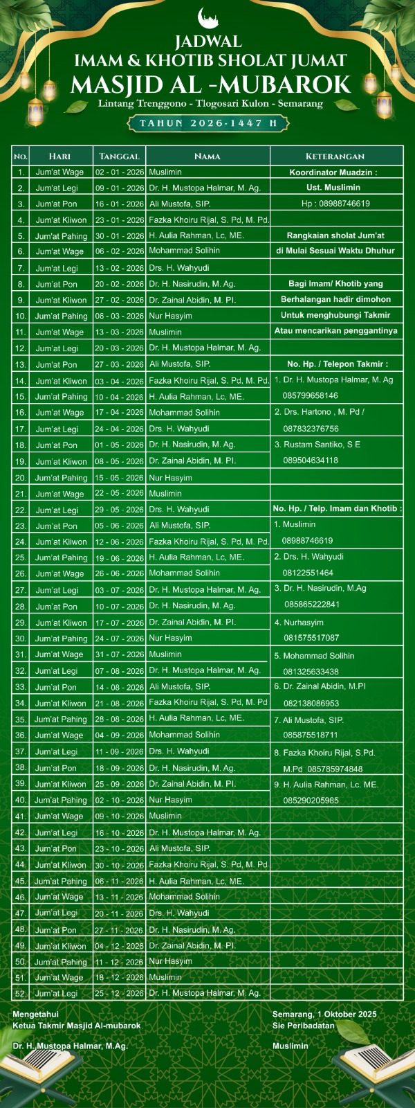 Alhamdulillah, kita kembali dipertemukan dalam suasana yang penuh keberkahan ini. Pada kesempatan yang berbahagia ini, kami ingin menyampaikan informasi terkait jadwal imam dan khotib di Masjid Al-Mubarok untuk tahun 2026.